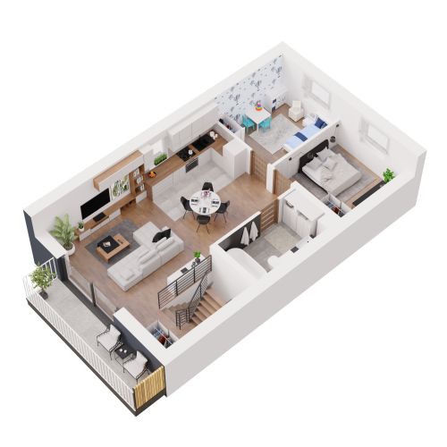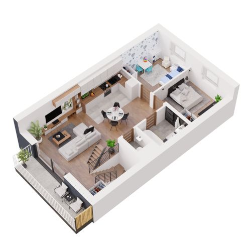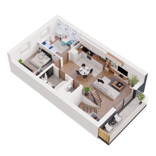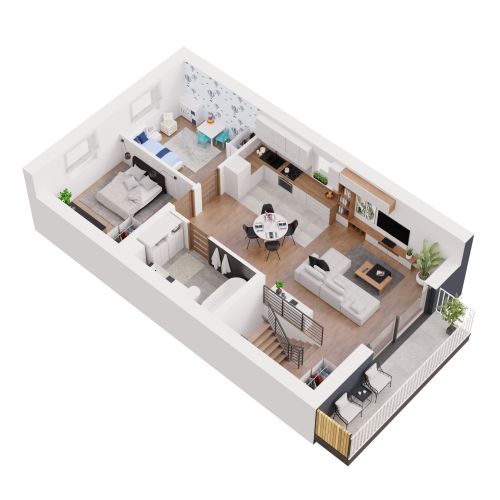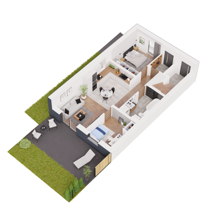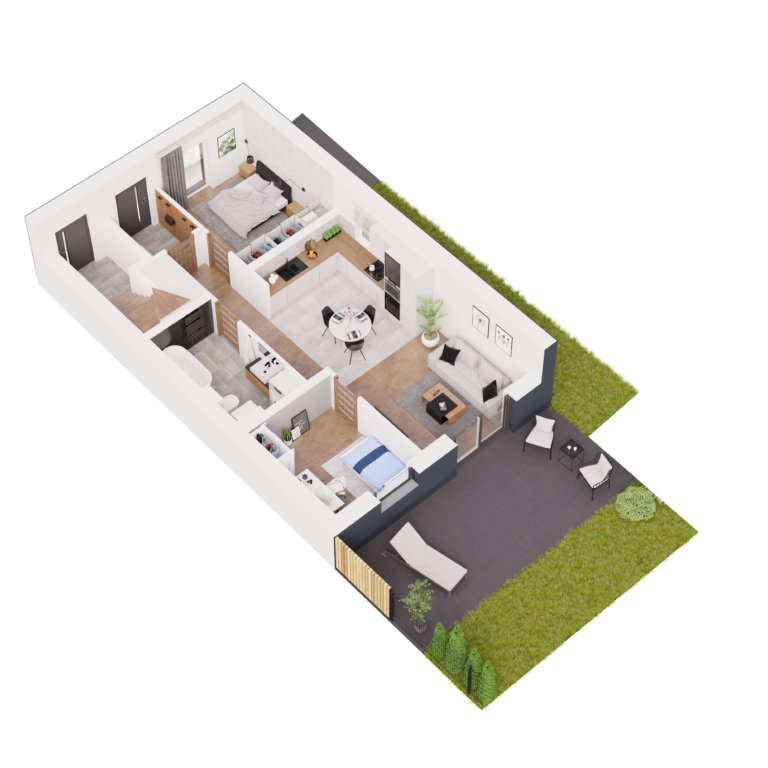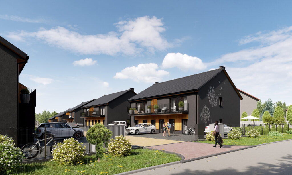 Mieszkania w budynkach 4-lokalowych na parterze mają powierzchnię mieszkalną 62,5 m² oraz tarasy w ogródkach. Lokale na piętrze o powierzchni mieszkalnej 110 m² (piętro + antresola) posiadają przestronne balkony i duże antresole, na których można urządzić np. gabinet do pracy, dodatkową sypialnię czy domową siłownię. Wszystkie lokale mieszkalne w budynkach 4-lokalowych posiadają własny ogrodzony ogródek o powierzchni ok. 70-90 m², w których komfortowo można odpoczywać na świeżym powietrzu, a także część wspólną. W celu zapewnienia prywatności mieszkańcom zamontowane zostały stylowe parawany, oddzielające sąsiadujące tarasy na parterze oraz balkony na piętrze.