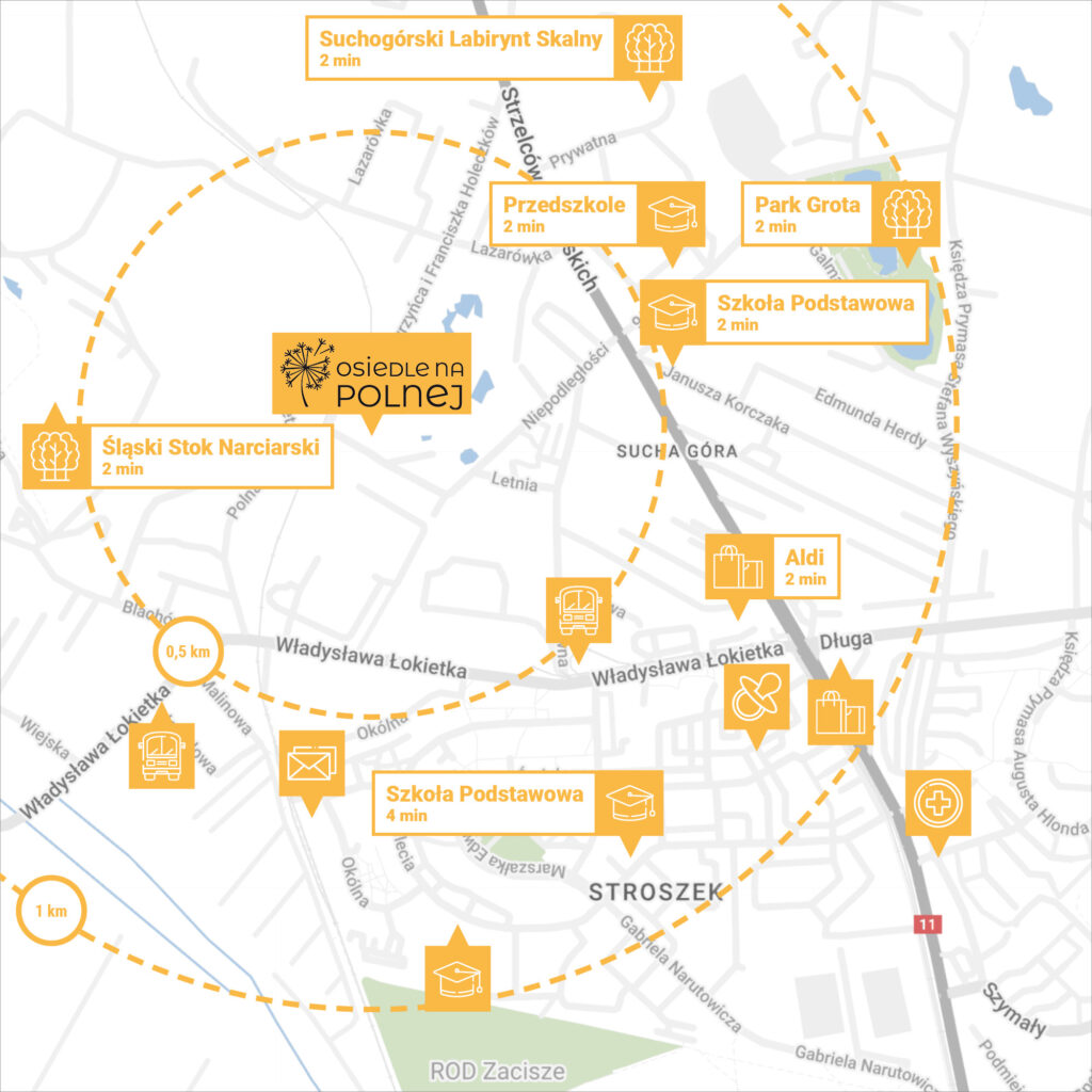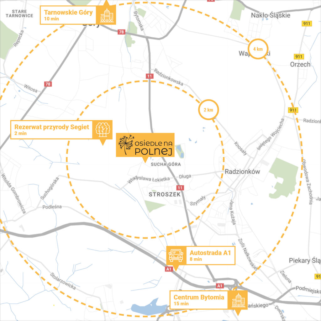 Osiedle znajduje się przy ul. Polnej w Bytomiu, w dzielnicy Sucha Góra. Lokalizacja ta jest dobrze skomunikowana – blisko m.in. do ul. Strzelców Bytomskich, prowadzącej do centrum Tarnowskich Gór, wjazdu na autostradę A1 oraz do centrum Bytomia. Niedaleko (ok. 700-800 m) także do przystanków autobusowych i tramwajowych, więc nawet bez samochodu można komfortowo poruszać się po całym regionie.Rozwiń ∨